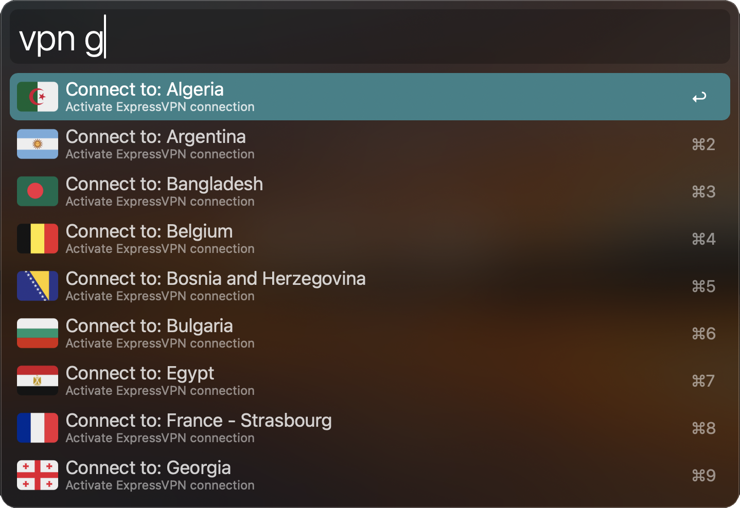 Alfred ExpressVPN An alfred workflow to manage your ExpressVPN connection Installation npm install --global alfred-expressvpn Screenshots