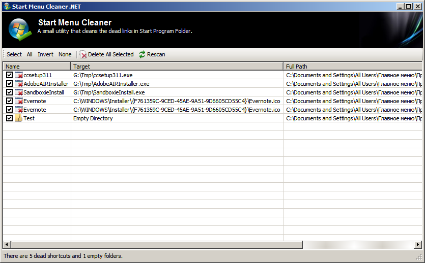 Start Menu Cleaner - это программа для очистки меню Пуск от "мертвых" ярлыков и пустых папок. Программа особенно полезна, если используется вместе с каталогизатором меню Пуск (наподобии SMOz).