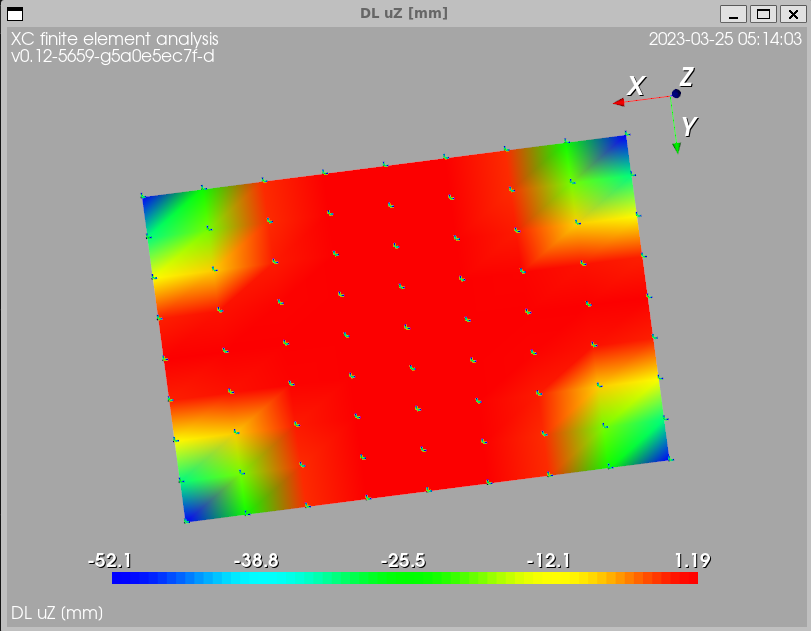 Hi, @ebrahimraeyat About the units: by default, the postprocessor assumes that all the units in the analysis are the SI fundamental units (kg, m, s) and derived ones (N, m/s, m/s2, …). Then, to display the displacement in millimeters, it multiplies the displacements by 1000. You can check that the displacements returned by the nodes (using getDisp) are not affected. Well, I don't know about SAFE, but I've seen the results of ANSYS for a lot of problems and I don't remember seeing a perfect symmetry ever. I think it's not important anyway. If that's OK with you, you can change the copyright, and we can add this example to the set of verification tests. |