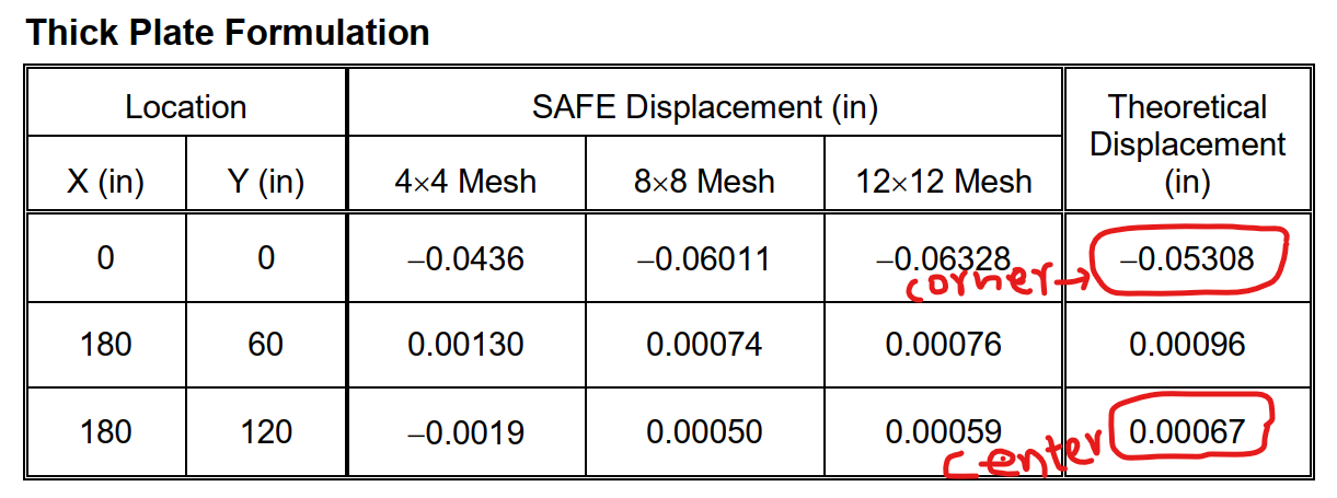 For the corner point, you get a displacement of -0.052 in and the theoretical value is -0.05308, so the error in your model is 2.03%. SAFE gets a displacement of -0.06011 in which corresponds to an error of 13.24% (higher than yours again).
